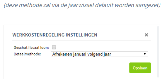 Afrekenen januari volgend jaar (Default bij jaarovergang) Er vindt gedurende het jaar geen tussentijdse afrekening plaats. De werkkosten worden het hele jaar opgebouwd en de totale eindafrekening wordt automatisch meegenomen in de loonaangifte van januari van het volgende jaar.