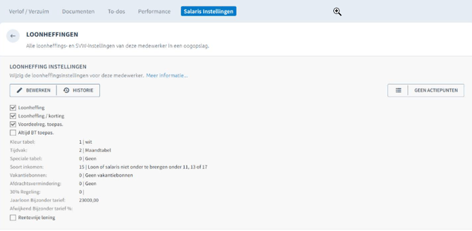 Op medewerkersniveau, onder 'Salarisinstellingen', vind je de instellingen voor de loonheffingen en werknemersverzekeringen (SVW). Hier kun je diverse gegevens vastleggen, zoals het toepassen van de loonheffingskorting, het jaarloon voor bijzonder tarief, de aard van de arbeidsverhouding en het volgnummer van de inkomstenverhouding.